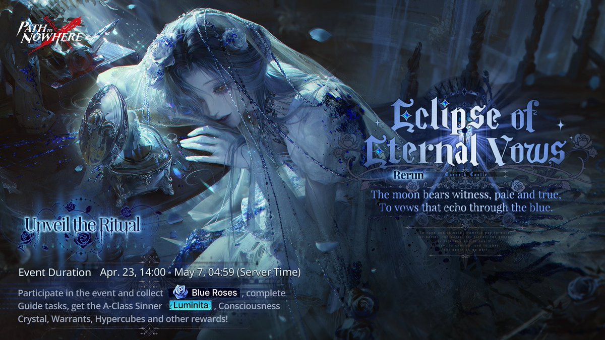 [Eclipse of Eternal Vows] Themed Event Limited-Time Rerun ■ Event Duration: Apr. 23rd, 14:00 - May 7th, 04:59 (Server Time) ■ Event Description: During the event, collect [Blue Rose] by participating in [Unfading Eventide] levels, [Tenebrous Shadows] elite challenges,