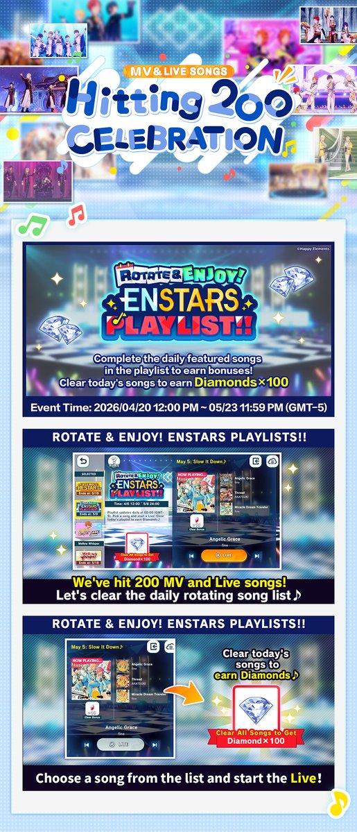 MV & Live Songs Hitting 200!! Celebration is starting soon! Log in to claim 1,000 Diamonds! Complete the daily featured songs in the playlist to earn training items! ‼️Enjoy Together! My Clips Share‼️ Share your favorite MV screenshots with the hashtag #ES200Songs! We will