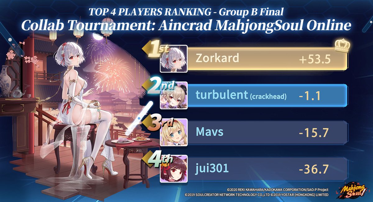 Aincrad MahjongSoul Online Elimination Stage for Group B is over! Thank you all for your enthusiastic participation. Congratulations to Zorkard and turbulent for advancing to the Grand Final! #SwordArtOnline #AMOTournament #MahjongSoul #Yostar