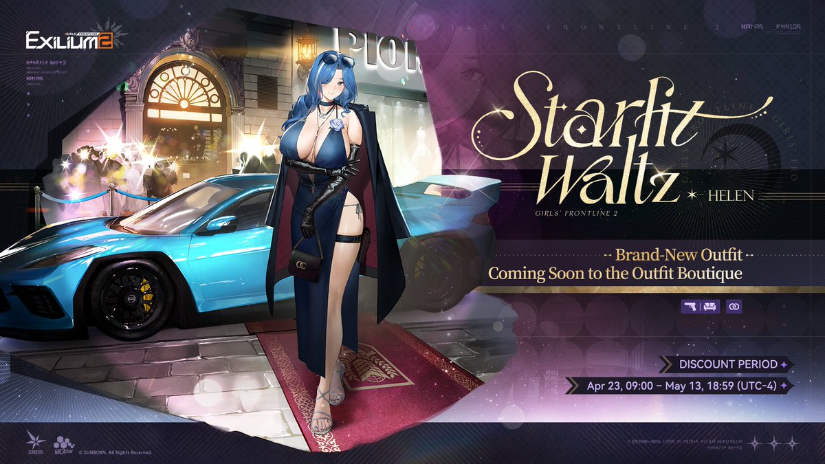 Helen's Outfit | Starlit Waltz Available for a limited-time discount in the Outfit Boutique starting from Apr 23, 09:00 - May 13, 18:59 (UTC-4). >> Download on mobile and PC: #GirlsFrontline2Exilium #gfl2exilium