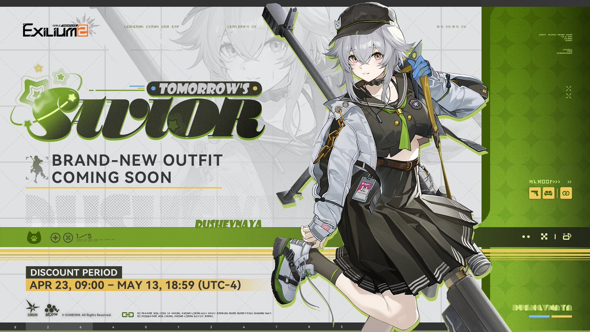 Dushevnaya's Outfit | Tomorrow's Savior Available for a limited-time discount in the Outfit Boutique starting from Apr 23, 09:00 - May 13, 18:59 (UTC-4). >> Download on mobile and PC: #GirlsFrontline2Exilium #gfl2exilium
