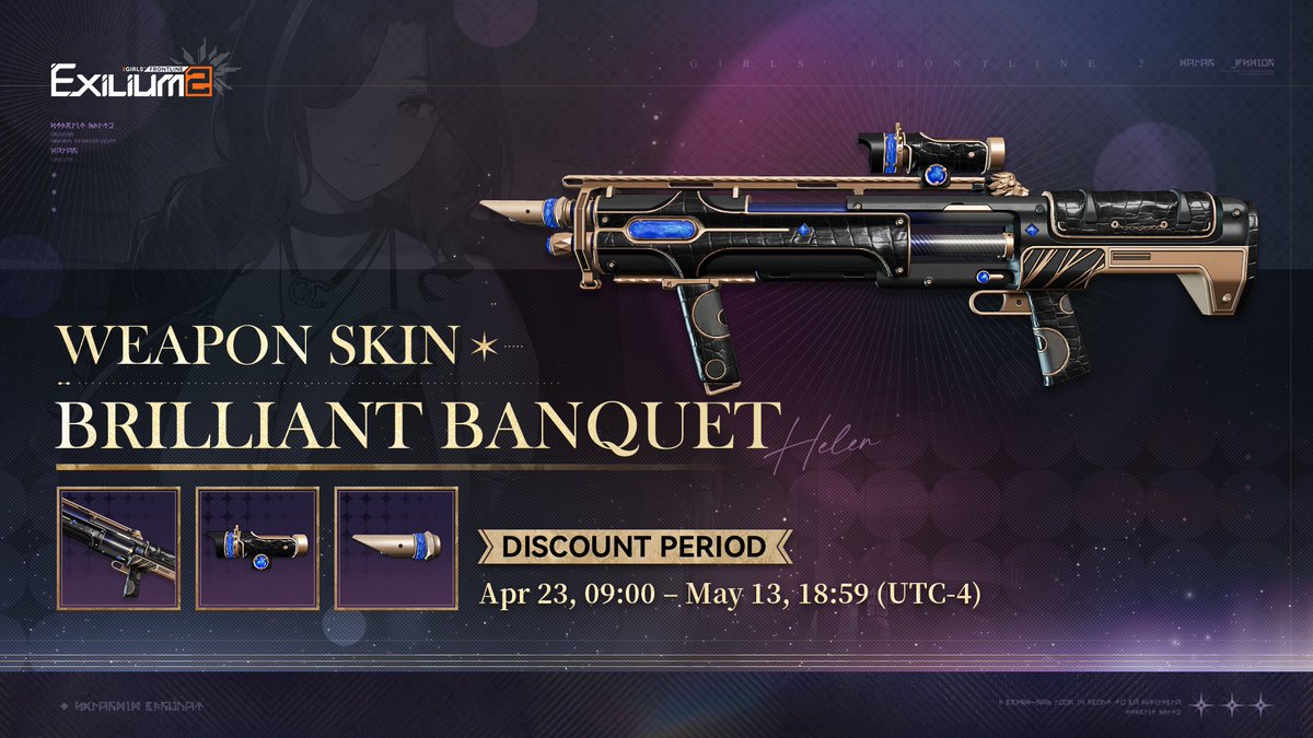 Weapon Skin | Brilliant Banquet The brand-new weapon skin [Brilliant Banquet] is on a limited-time discount from Apr 23, 09:00 - May 13, 18:59 (UTC-4). >> Download on mobile and PC: #GirlsFrontline2Exilium #gfl2exilium