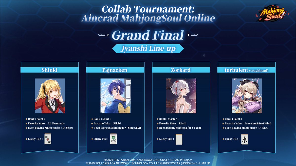 Collab Tournament: Aincrad MahjongSoul Online - Grand Final Contestants After battling through all the rounds, we proudly present the four Jyanshi Sama who made it to the Grand Final: Shinki, Pajnacken, Zorkard, turbulent. Show your support and cheer for your champions. Let's