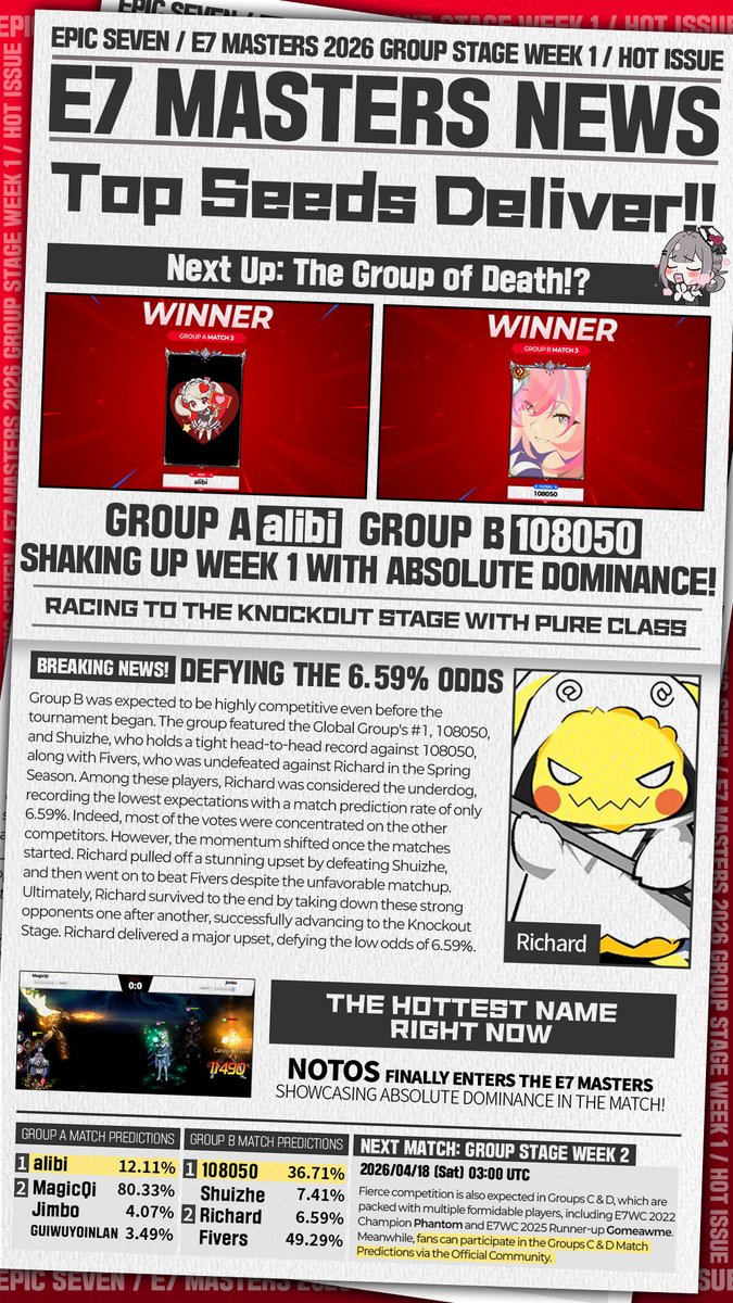 ✨Epic Seven Masters 2026 Week 1 Match Highlights Feel the heat from E7Masters 2026 Week 1! Be sure to tune in! E7Masters 2026 Group Stage continues with Group C & Group D on 4/18 (Sat) at 03:00 UTC. See you there! 🔗 Go to Epic Seven Masters 2026 Group A & Group B Mat