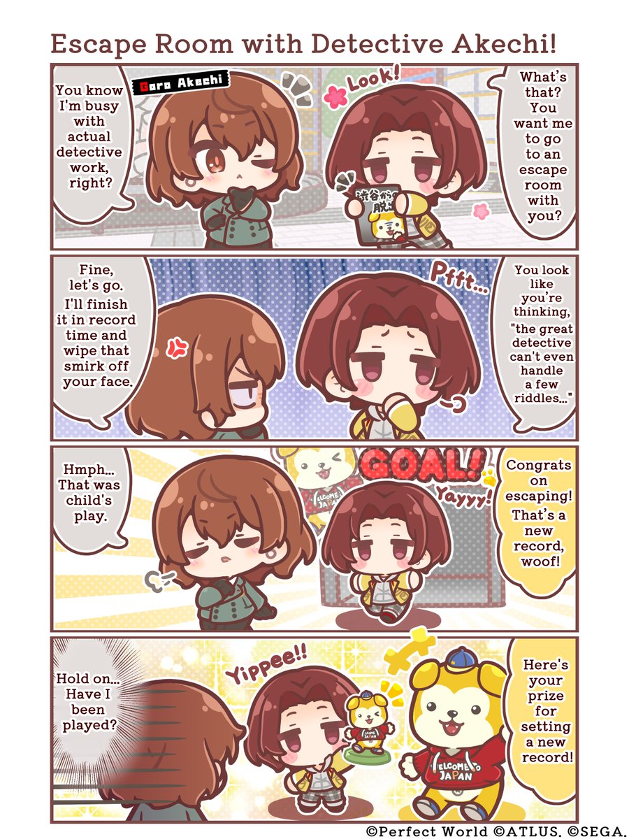 ╋━━ P5Xfourpanel comic ━━━╋ The (ir)regular serialization of P5X's official 4-panel comic continues! Just another normal day for the Phantom Thieves and friends... 🚲 Chapter 6: Escape Room with Detective Akechi! Akechi isn't interested in a silly escape