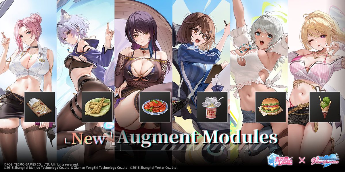 Dear Commander, The following new Augment Modules are available in-game between 4/17 - 5/1, 11:59 P.M. (UTC-7)! Elise - Stollen Shizuku - Shishamo Tempura Shandy - Chili Crab Tsukushi - Cup Ramen Patty - Hamburger Yukino - Matcha Ice Cream #AzurLane #Yostar #DOAXVV