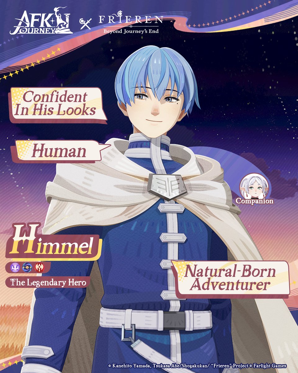 Himmel | The Legendary Hero Now meet Himmel, the self-proclaimed heartthrob, oozing confidence with every step he takes. An adventure genius, Himmel thrives on the unknown of the journey. Whenever someone's in need, he's there to lend a hand—a true hero through and through. AFK