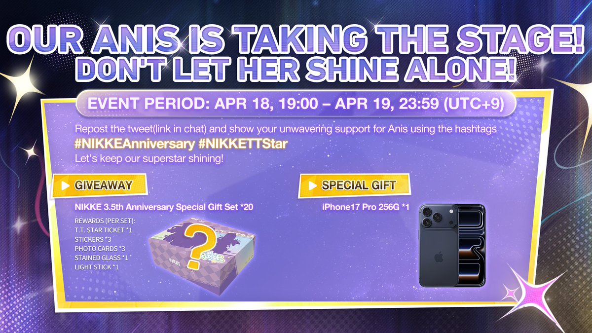 【GODDESS OF VICTORY: NIKKE 3.5th Anniversary Livestream Special Giveaway】 #NIKKEAnniversary #NIKKETTStar Commander! Our Anis is taking the stage — don’t let her shine alone! ✨ How to Join: Repost this post and show your unwavering support for Anis with the hashtags