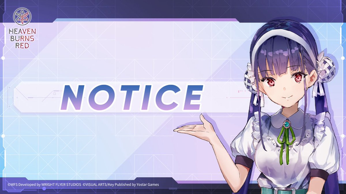 Extended Maintenance Notice We are sorry to inform you that the maintenance will be extended. And we will issue an announcement once the update is complete. We apologize for any inconvenience and we'll keep you updated. Thank you for your understanding. #HeavenBurnsRed #Yostar