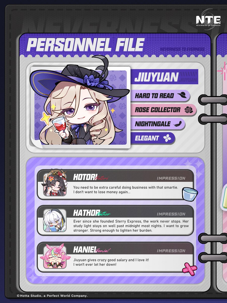 Leisure Time丨Jiuyuan "Appraiser, fancy seeing you at this hour." "Now that you've stepped into my domain, you'll have to play by my rules." "For starters... take a sip from my priceless wine collection." NTE launches on all platforms April 29! Pre-register now >>
