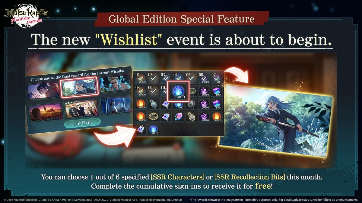 ◤#JujutsuKaisenPhantomParade◢ \April [Wishlist] is now live!/ The [Wishlist] feature, where you can obtain an SSR Character or Recollection Bits for free, is now back! Check in to earn the reward you’ve been eyeing! ※You need to select "Final Reward" before