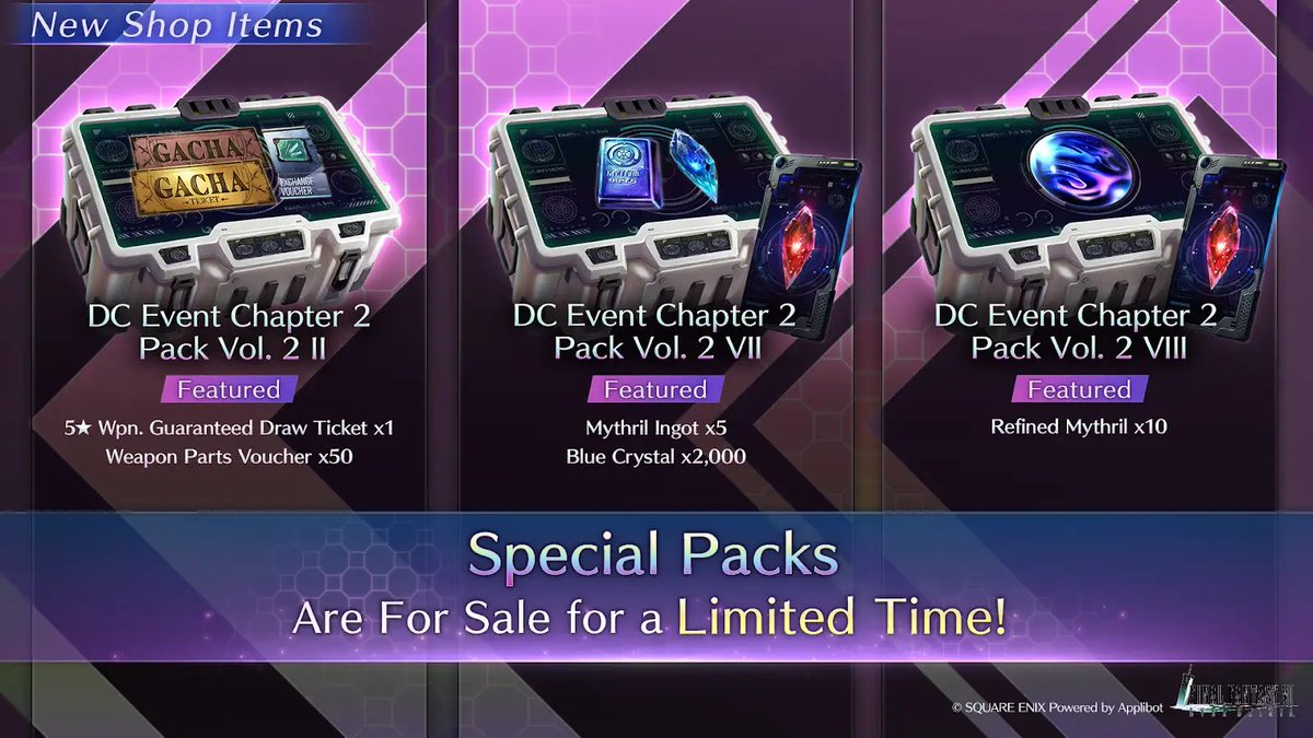 DC Event Chapter 2 Packs Vol. 2 Available Now Packs which can contain Refined Mythril x10 and more are available for purchase now! *Please check the in-game notice for details. #FF7EC #FF7EverCrisis