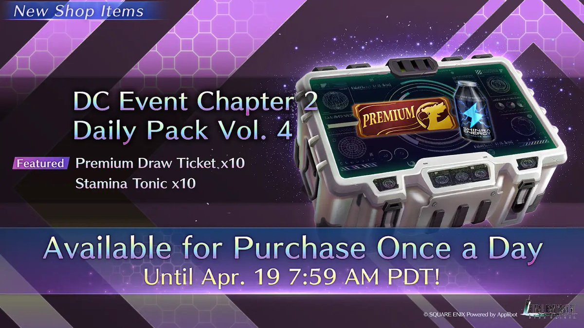DC Event Chapter 2 Daily Pack Vol. 4 Available Now DC Event Chapter 2 Daily Pack Vol. 4 which includes Premium Draw Ticket x10 and more is available for purchase now! *Please check the in-game notice for details. #FF7EC #FF7EverCrisis