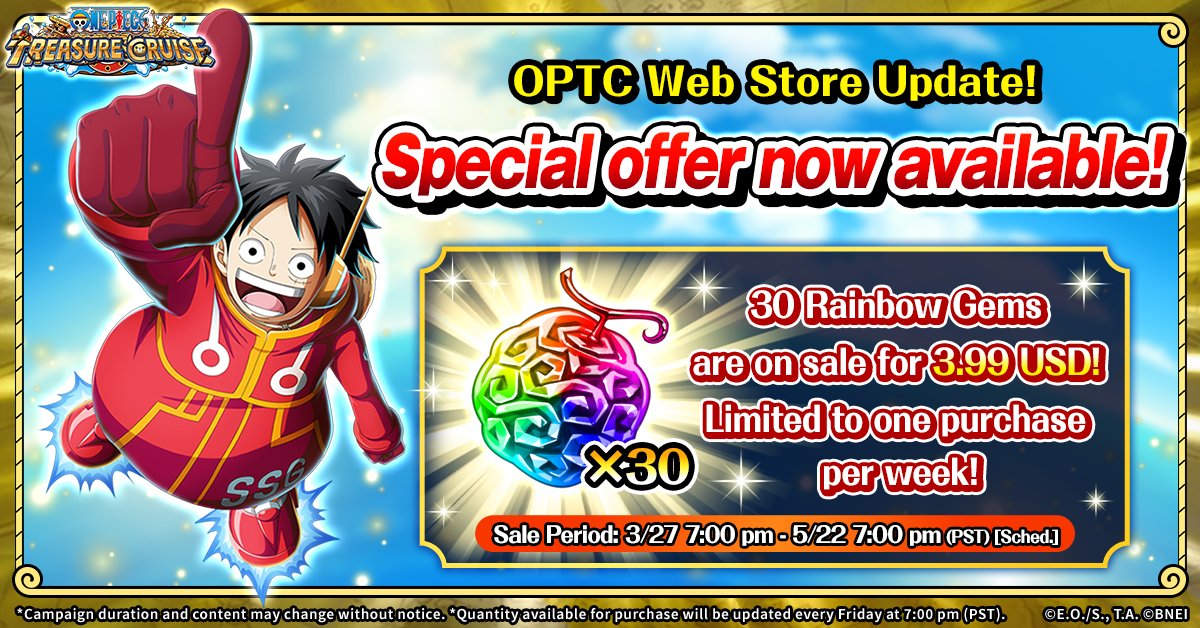 📢 OPTC Web Store Update! A new offer has arrived! ✨Grab 30 Rainbow Gems for 3.99USD✨ Available once per week until May 22nd 19:00 PST! Check it out now: #ONEPIECE #OPTC