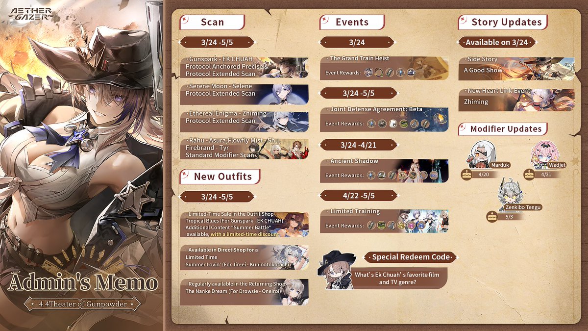 Admin's Memo| Theater of Gunpowder Hello, dear Admin! V4.4 "Theater of Gunpowder " has started!🎉 I've prepared an event memo for this version just for you—save it and check it out! 🎁I've hidden a little Easter Egg in it, and the answer is the redeem code! How to Redeem: