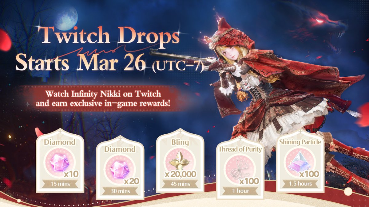 Twitch Drops for Version 2.4 are coming soon! Watch any participating streamers and claim your rewards as you go! Event Period: Mar 26 – April 22, 2026 (UTC-7) How to join: Link your Twitch and Infinity Nikki accounts here ➤ —— ➤ Infinity Nikki Version