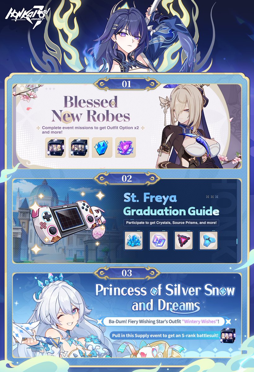 ☆☆ Weekly Events Update ☆☆ On MAR 30, Blessed New Robes begins! On APR 2, St. Freya Graduation Guide begins! On APR 3, Outfit Supply "Princess of Silver Snow and Dreams" opens! ※ Please refer to in-game announcements for more details. #DayWithMei #HonkaiImpact3rd