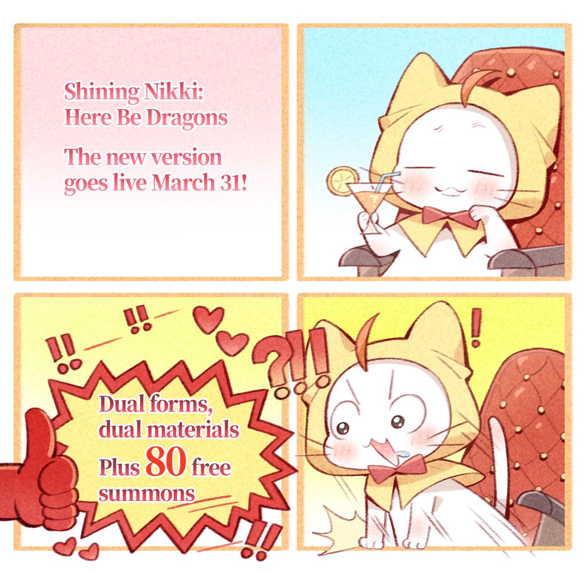 Shining Nikki: Here Be Dragons. The new version goes live March 31! Dual forms, dual materials. Plus 80 free summons! Reach 300 Reposts to unlock a redeem code!