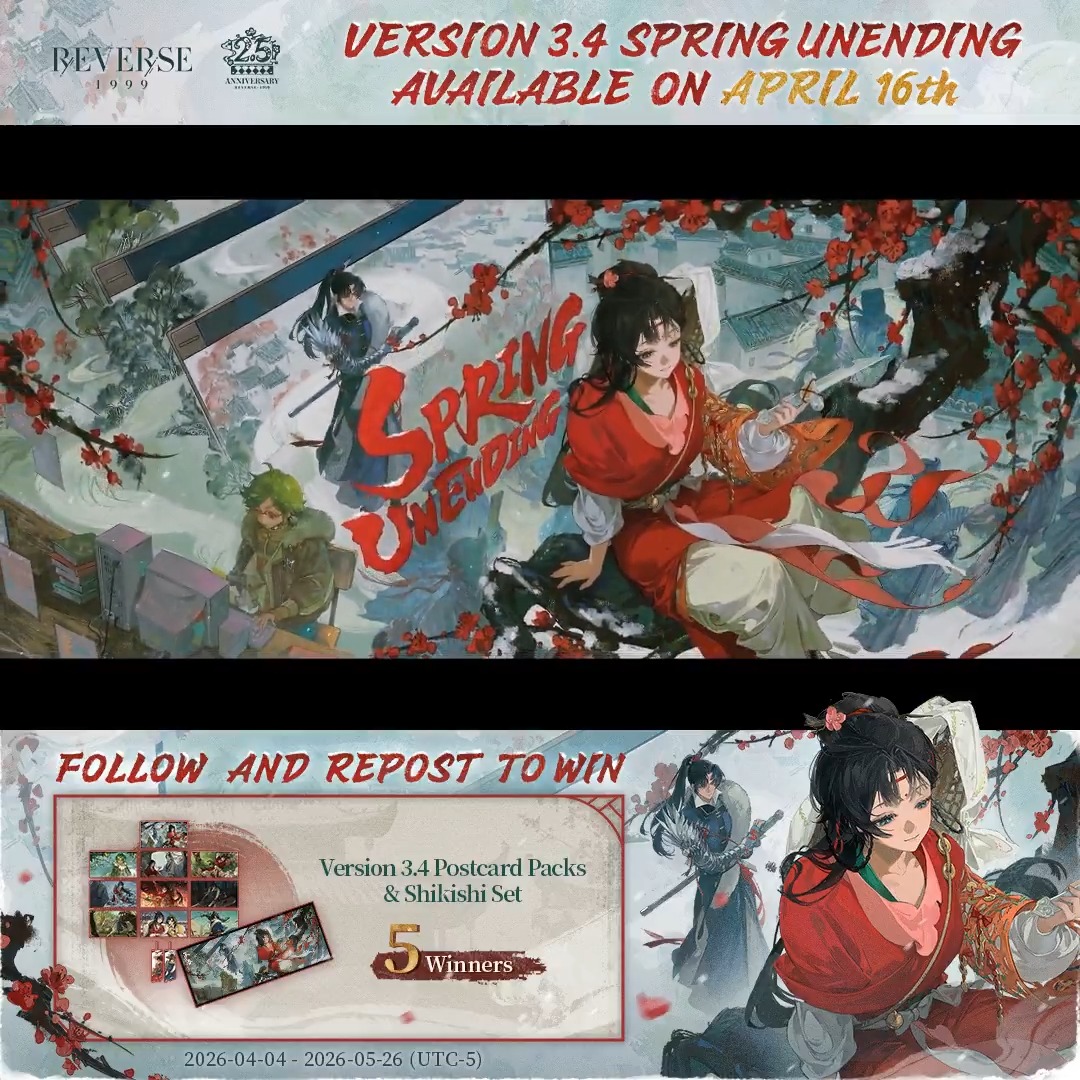 Reverse: 1999 Version 3.4 Spring Unending is now available! All things follow the Way—withering and blooming in turn. All is as it's meant to be. If hardship lies ahead, should one accept it ... or defy it? For Further Info: #Reverse1999Ver3ꓸ4