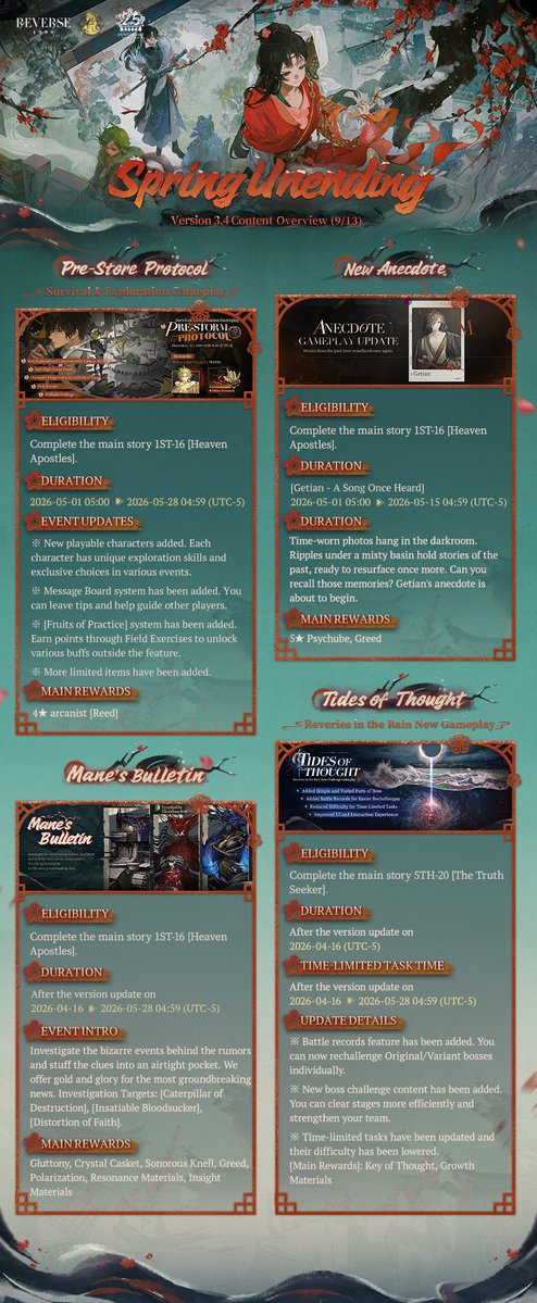 [Devs Broadcast] Thanks for all the feedback and support. Version 3.4 Spring Unending will launch on April 16th (UTC-5) with new events, stories, and arcanists. We will be hosting the Reverse: 1999 2.5th Anniversary Preview Program on April 4th, 8:00 AM (UTC-5). To show our